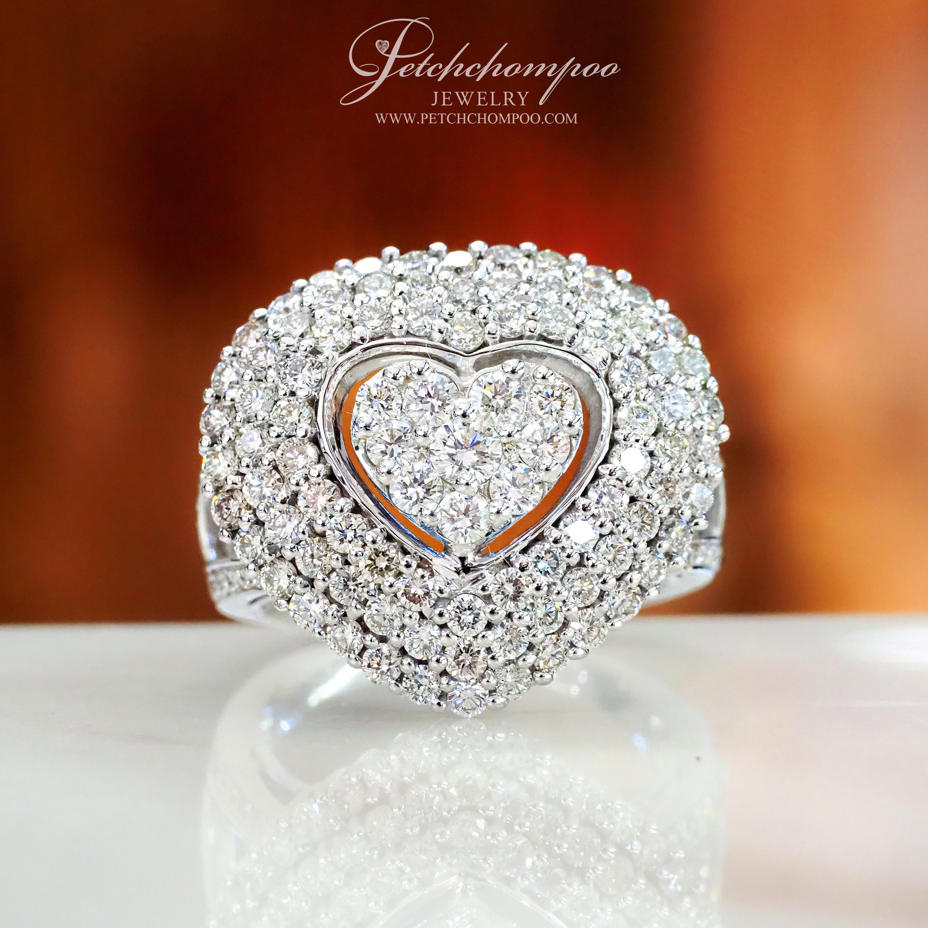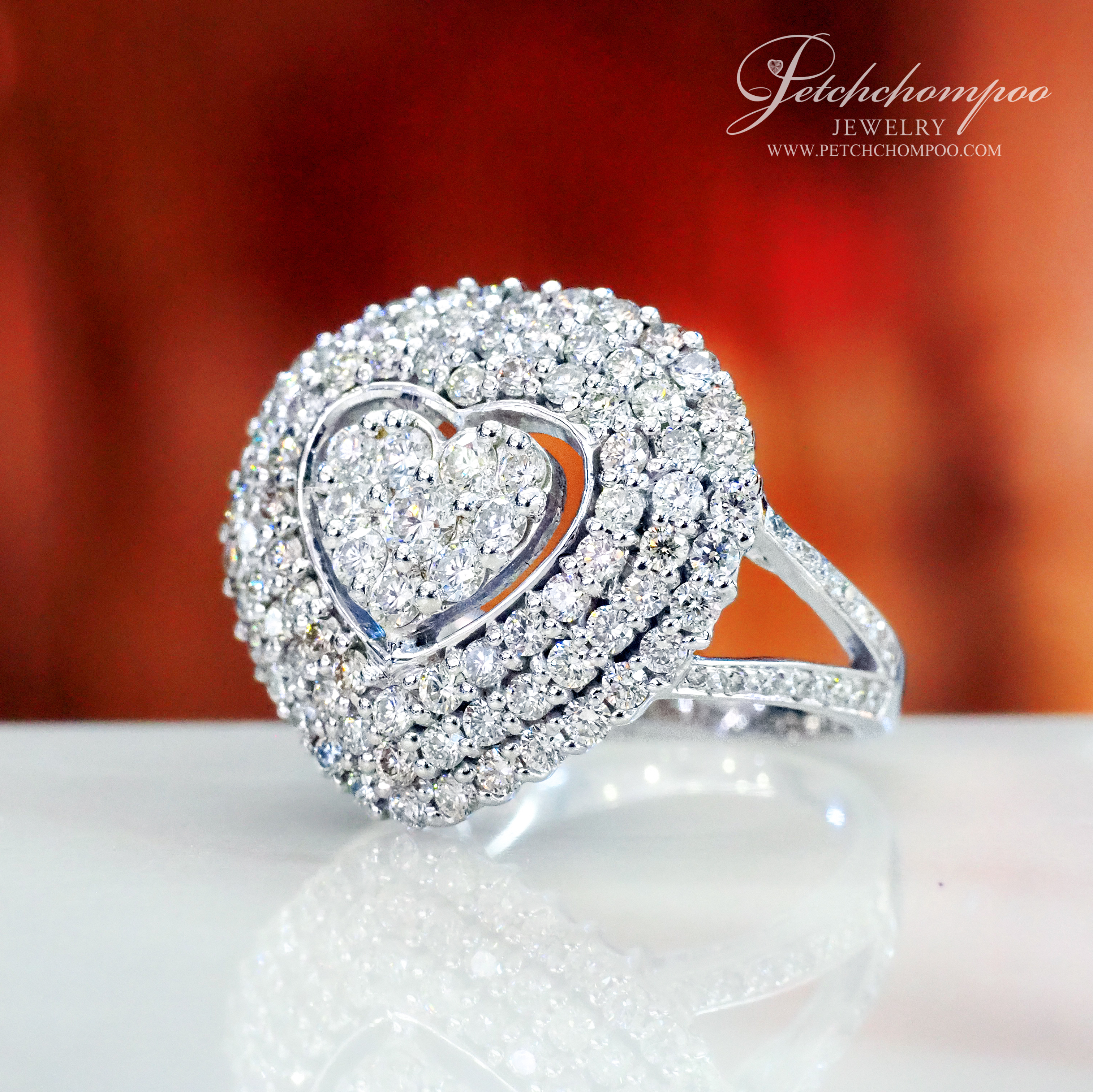 แหวนทรงโดมล้อมหัวใจ ดีไซน์หรูหราแบบเต็มพื้นที่ ประดับด้วยเพชรกลมแท้ทั้งหมด 120 เม็ด น้ำหนักรวม 2.12 กะรัต ฝังแน่นในลวดลายหัวใจกลางวงแหวนและไล่ระดับทั่วตัวเรือน ตัวเรือนทองคำขาว 18K น้ำหนัก 8.74 กรัม ดีไซน์สื่อถึงความรักที่มั่นคง งดงาม และทรงพลังในทุกมุมมอง → แหวนที่จะทำให้ทุกวันคือวันพิเศษสำหรับคุณ