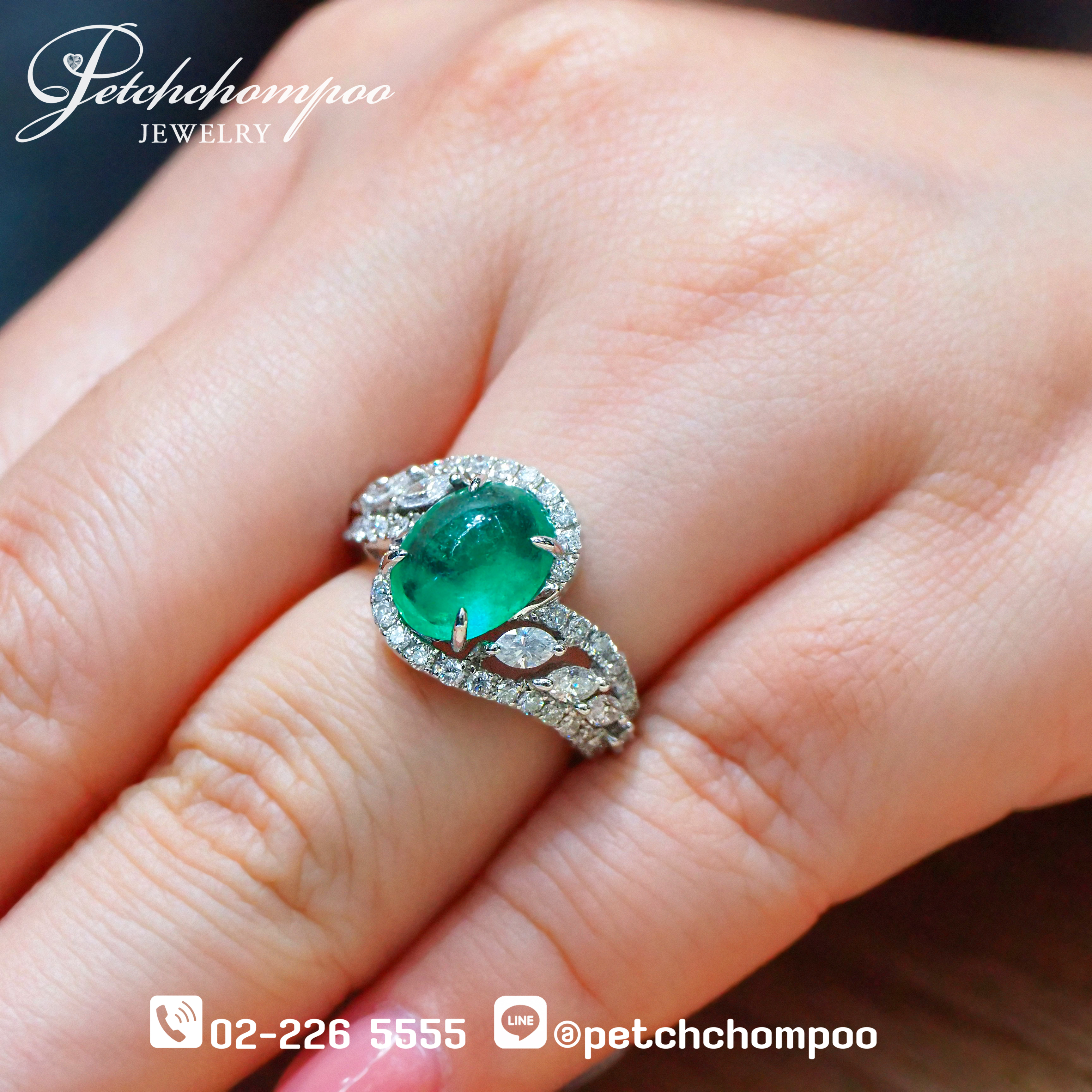 สัมผัสความหรูหราเหนือระดับกับแหวนมรกตทรงโอวัลสีเขียวสดใสจากแซมเบีย น้ำหนัก 3.26 กะรัต ดีไซน์โดดเด่นด้วยการล้อมเพชร 50 เม็ด น้ำหนักรวม 1.14 กะรัต โดยจัดวางสลับระหว่างเพชรทรงกลมและทรงมาร์คีส์ ให้เส้นสายเหมือนใบไม้โอบล้อมมรกตไว้อย่างอ่อนช้อย ตัวเรือนทองคำขาว 18K น้ำหนัก 4.64 กรัม เหมาะสำหรับหญิงสาวผู้มีรสนิยมที่รักความอ่อนหวานแต่สง่างาม