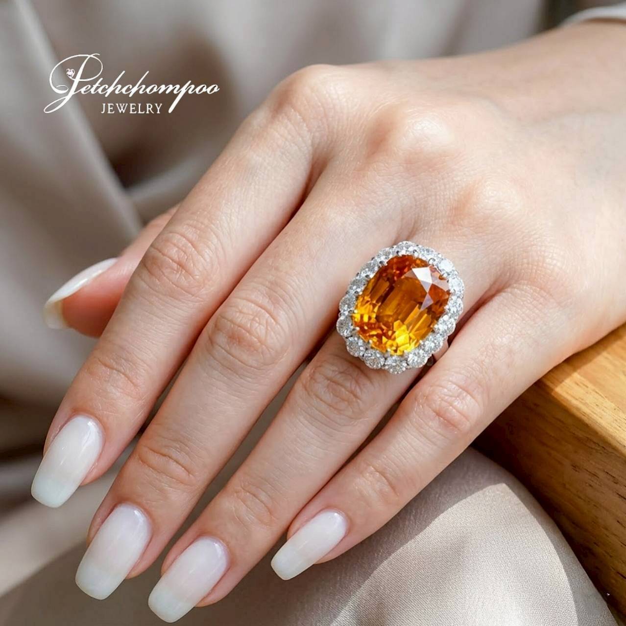 แหวนบุษราคัมบางกะจะ Amber Radiance™ 10.13 กะรัต ล้อมเพชร | Emil