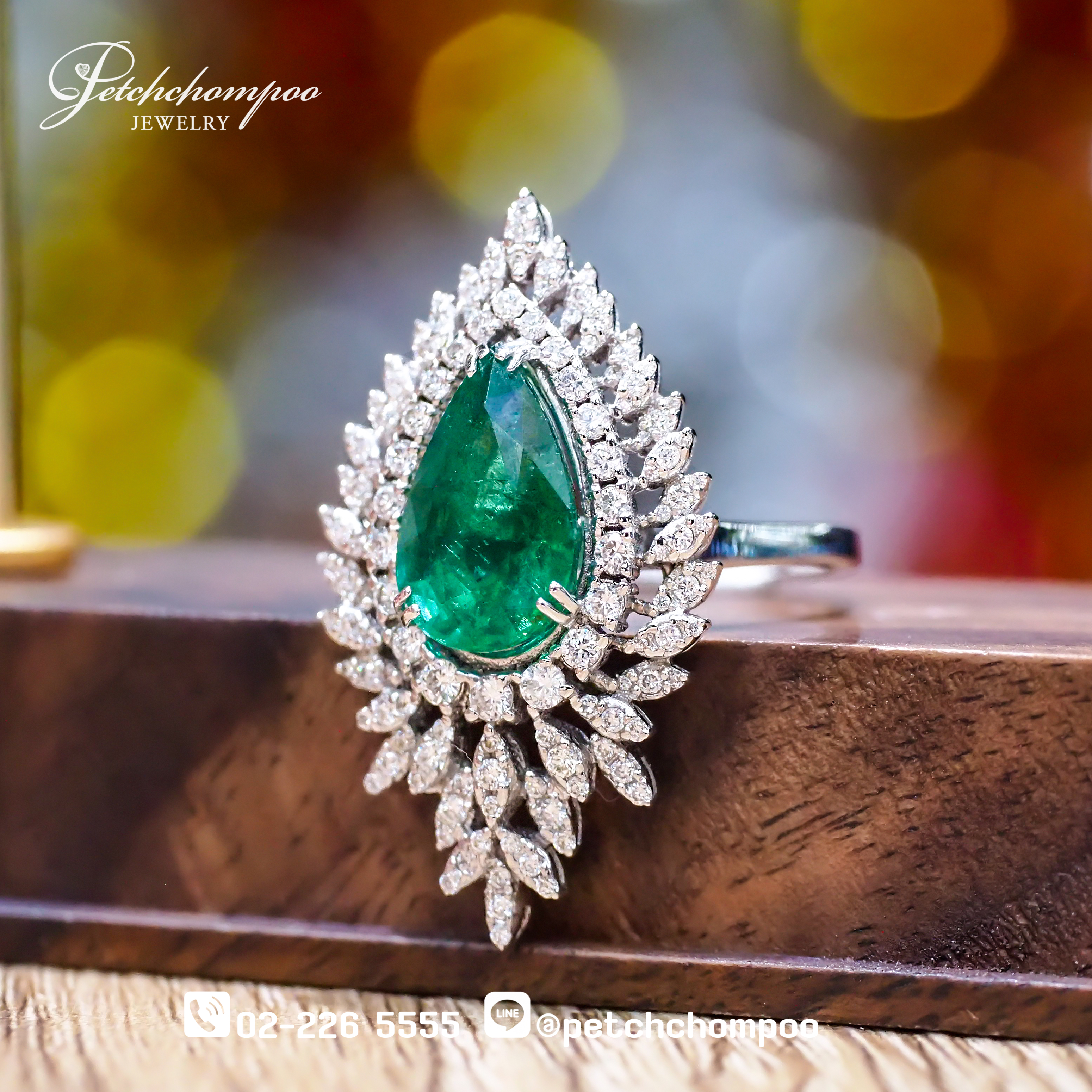 แหวนมรกตแซมเบียเม็ดกลางทรงหยดน้ำ ขนาด 3.53 กะรัต งดงามโดดเด่นและเปล่งประกายเป็นประกายสีเขียวล้ำค่า รายล้อมด้วยเพชรแท้รวม 133 เม็ด น้ำหนัก 1.50 กะรัต ดีไซน์ล้อมอย่างประณีตในรูปแบบขนนกซ้อนชั้นที่สง่างามราวเครื่องประดับของราชินี ตัวเรือนทองคำขาว 18K น้ำหนัก 5.92 กรัม คือบทกวีแห่งงานฝีมือที่ยกระดับสไตล์ของคุณให้เปล่งประกายเหนือใคร