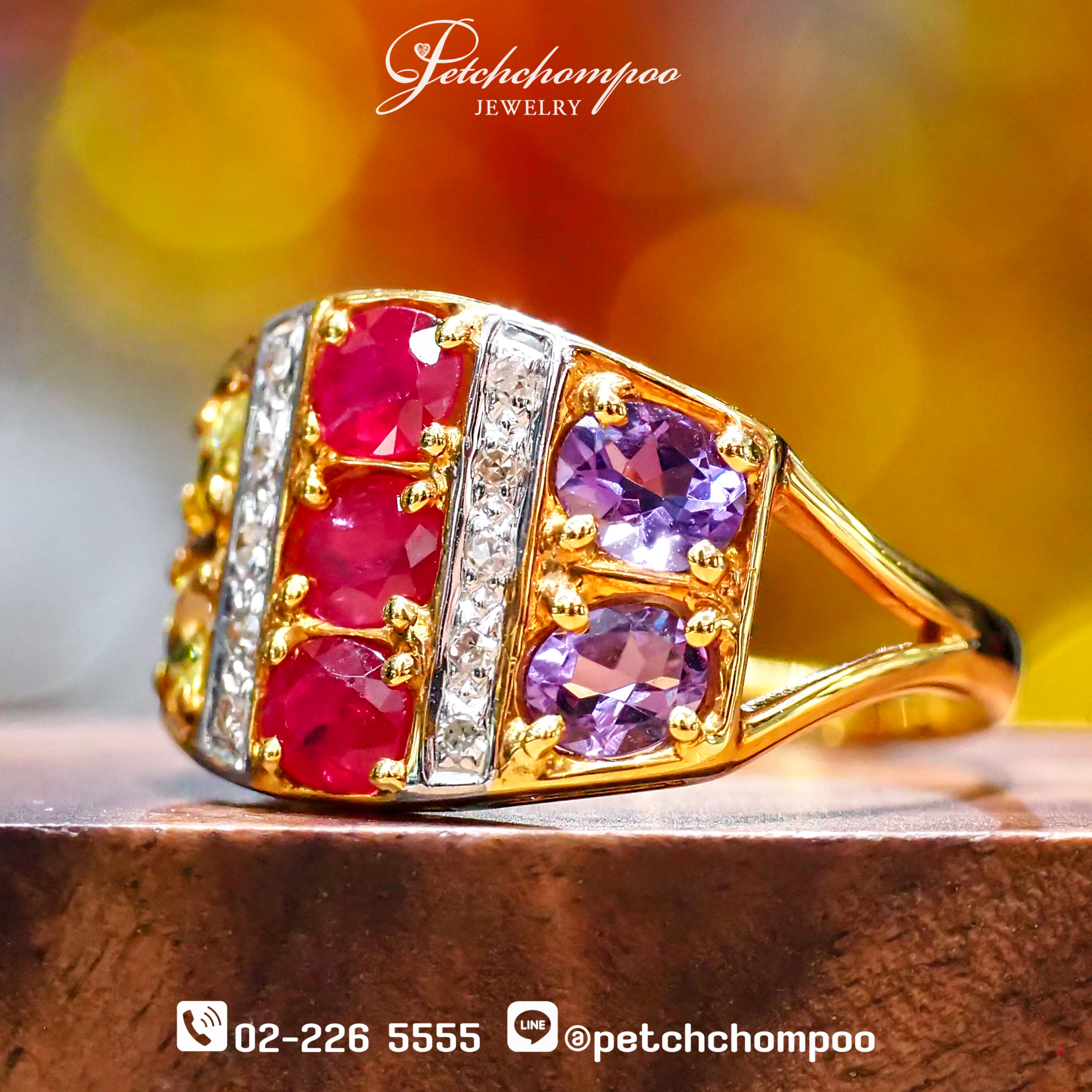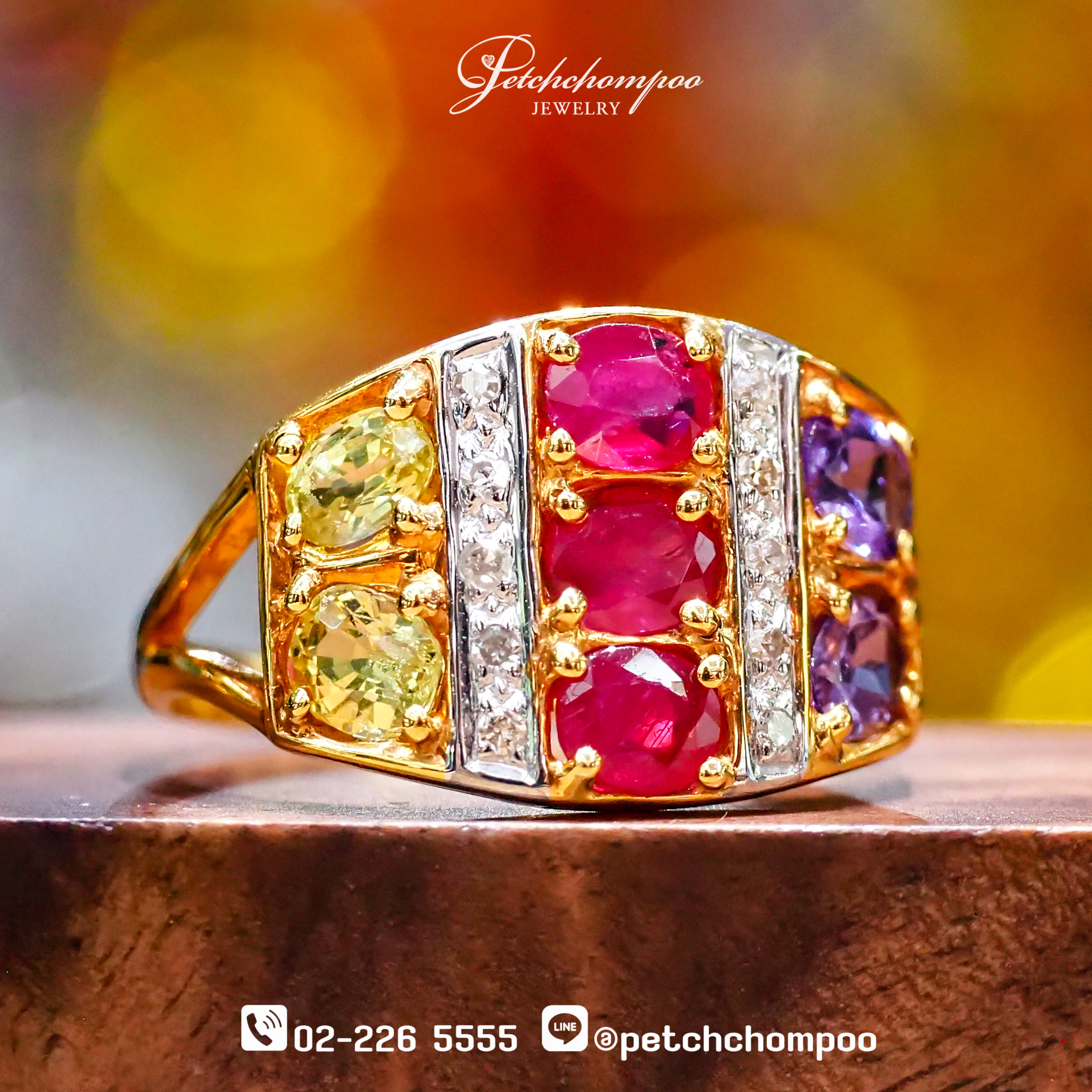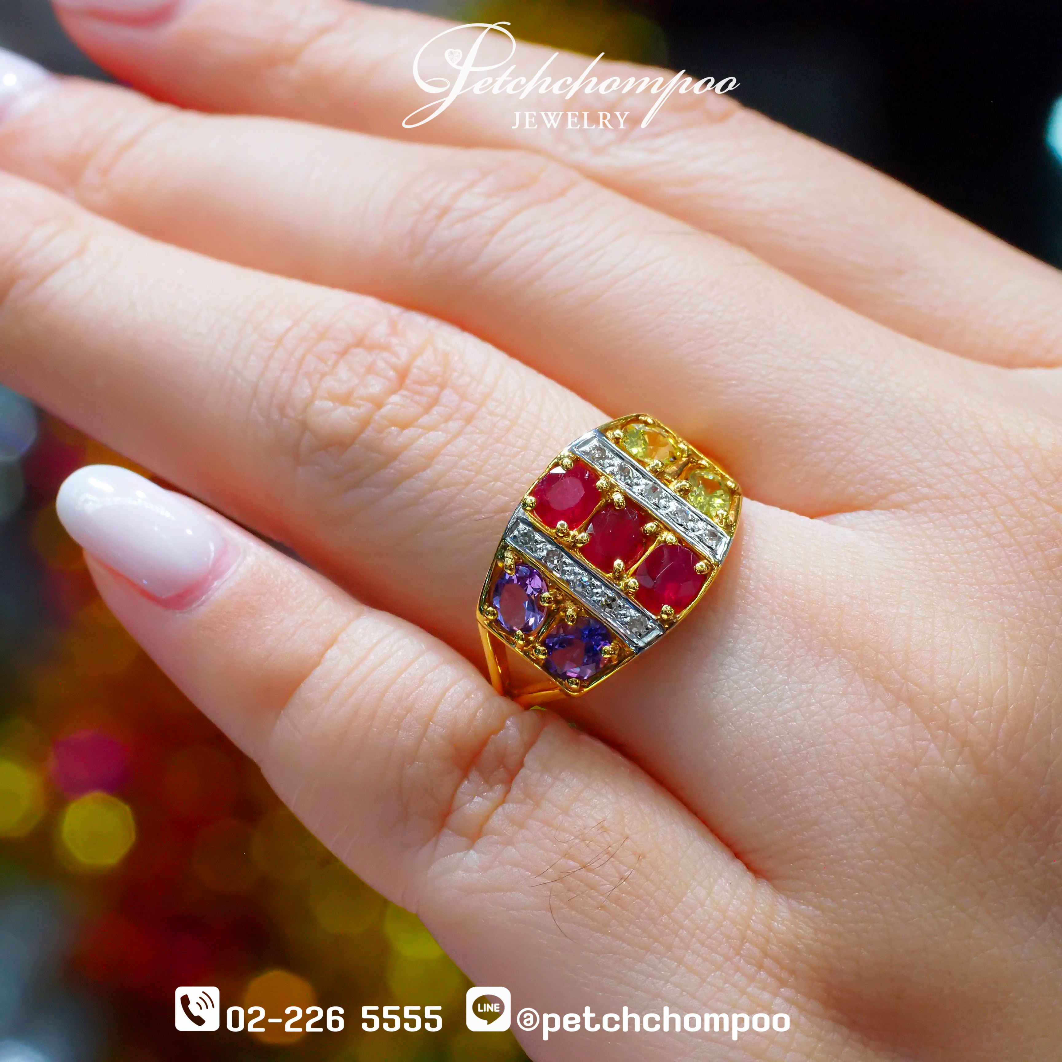แหวนแฟชั่นดีไซน์หรูที่โดดเด่นด้วยการผสมผสานพลอย 3 สี ได้แก่ แดงเข้ม แดงอมชมพู ม่วง และเหลืองสดใส ไล่เฉดสีอย่างประณีต พร้อมเสริมความเปล่งประกายด้วยเพชรแท้เรียงแถวคู่ขนานสองด้าน ช่วยขับให้สีสันของอัญมณีดูโดดเด่นยิ่งขึ้น ตัวเรือนทองดีไซน์หนาน้ำหนักดี สวมใส่แล้วให้ลุคสง่างามและแฝงพลังบวกจากธรรมชาติ