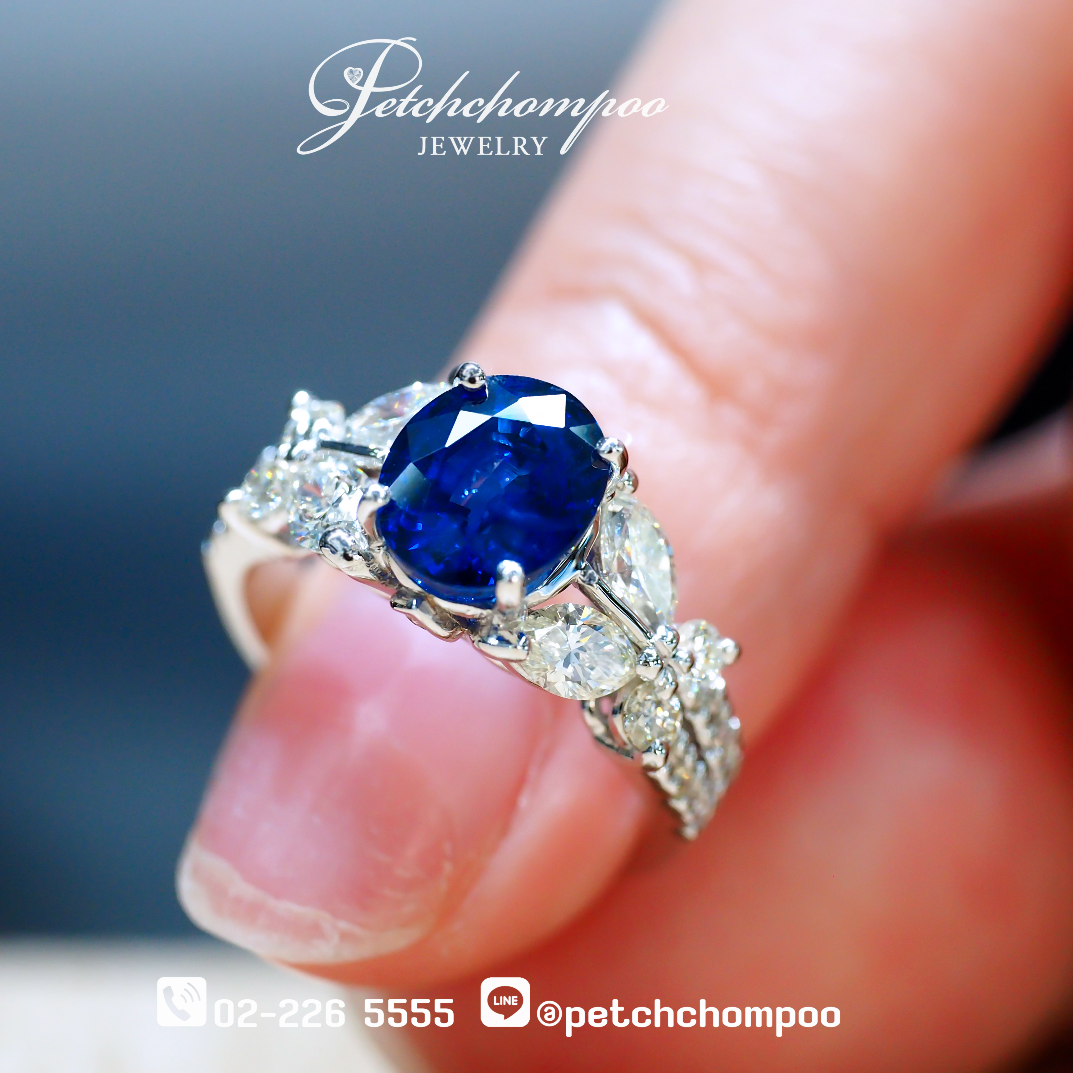 แหวน Ceylon Sapphire Étoile โดดเด่นด้วย ไพลินซีลอนแท้ 2.13 กะรัต เม็ดกลางทรงโอวัลสีน้ำเงินสดลึกแบบ Royal Blue เฉดที่ขึ้นชื่อว่าเปล่งประกายที่สุดในกลุ่มไพลินธรรมชาติจากศรีลังกา เม็ดกลางประกายสด คัดคุณภาพอย่างพิถีพิถันให้ไฟดี สีสวย และสะท้อนความหรูหราในทุกองศา ข้างตัวเรือนประดับด้วยเพชรคุณภาพสูงรวม 0.92 กะรัต (22 เม็ด)